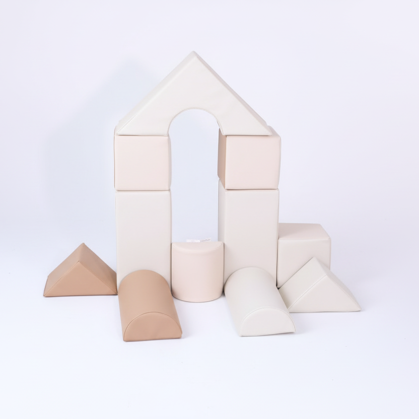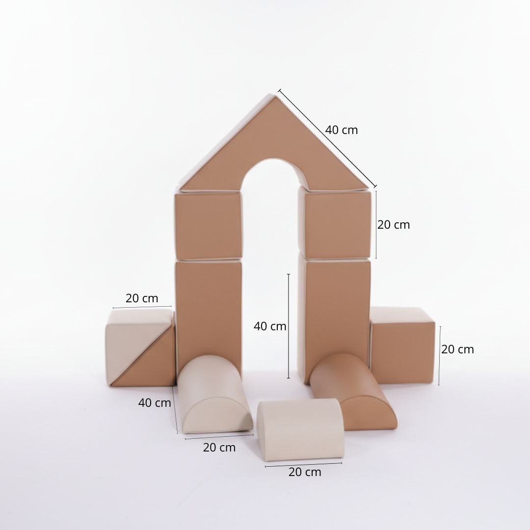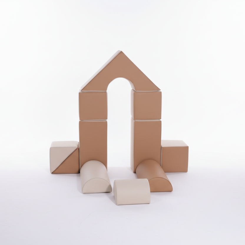 De blokken zijn gemaakt van hoogwaardig schuim en bekleed met premium vegan leer. Dit materiaal voelt zacht aan, biedt optimale ondersteuning en is eenvoudig schoon te houden met een vochtige doek. De set is bestand tegen intensief dagelijks gebruik en voldoet aan de hoogste veiligheidsnormen. Het lichte gewicht maakt het voor kinderen makkelijk om de blokken zelfstandig te dragen, te stapelen en te verplaatsen.